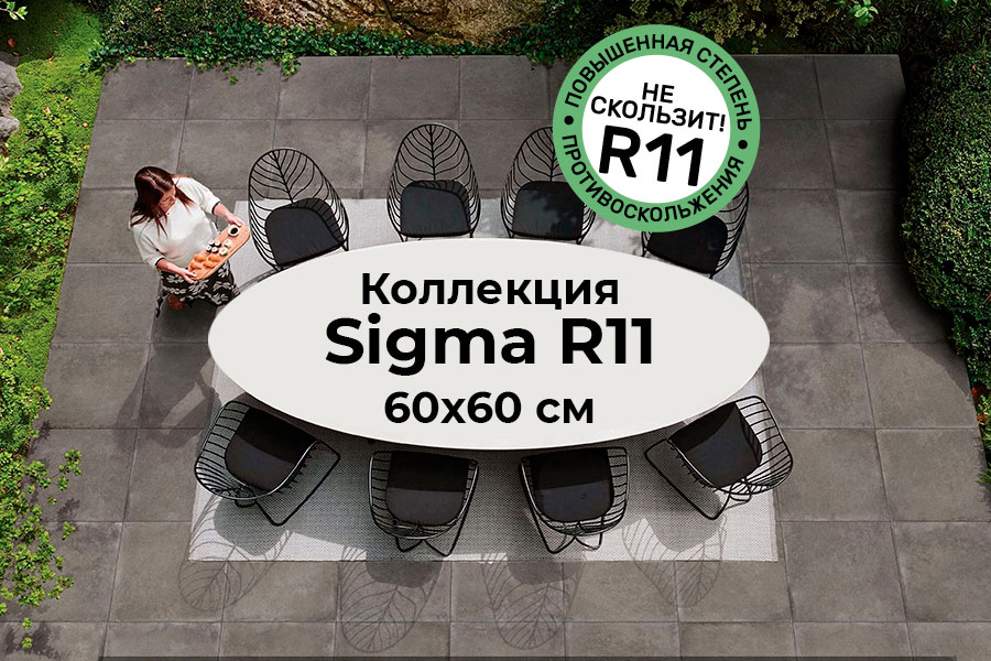 Отличительной особенностью плиты является специальное покрытие с повышенной степенью противоскольжения R11, что позволяет использовать коллекцию для коммерческих и производственных объектов, а также для зон с повышенной проходимостью. Благодаря высокой прочности, износостойкости и низкому водопоглощению керамограниту Sigma не страшны низкие температуры и ультрафиолетовые лучи. Коллекция станет идеальным напольным покрытием для уличных зон, террас и веранд.