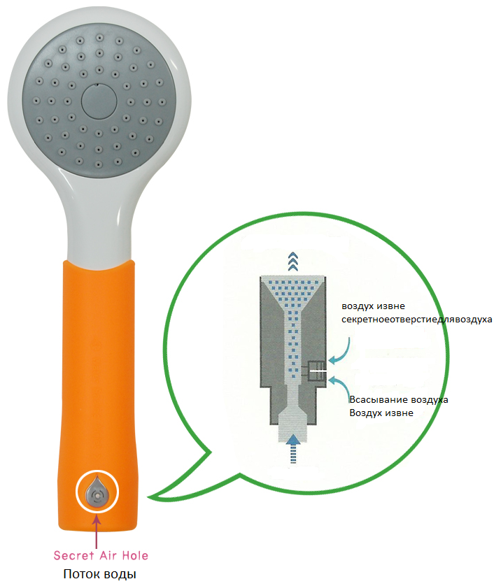 Дополнительная насадка для душевой панели повышает напор и экономию воды. Напор воды повышается за счет смешивания воды с воздушным потоком, который поступает через отверстие в нижней части лейки. Выход водяного потока обеспечивает массаж с помощью микропузырьков. В лейке увеличивается напор и объем водяного потока, что позволяет экономить воду (до 40%) по сравнению с обычными лейками.