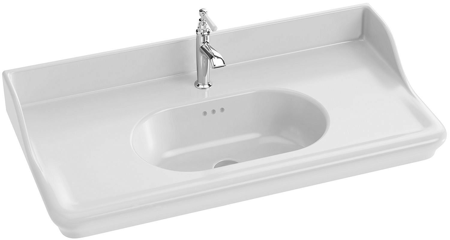 Высокий борт у стенки (10 см) и характерные боковые ребра придают ванной комнате ретро вид, привнося больше комфорта. Керамическая заглушка с логотипом JD входит в комплект.Широкая столешница где можно разместить свои принадлежности. 3-отверстия для слива-перелива, 1 отверстие для смесителя.