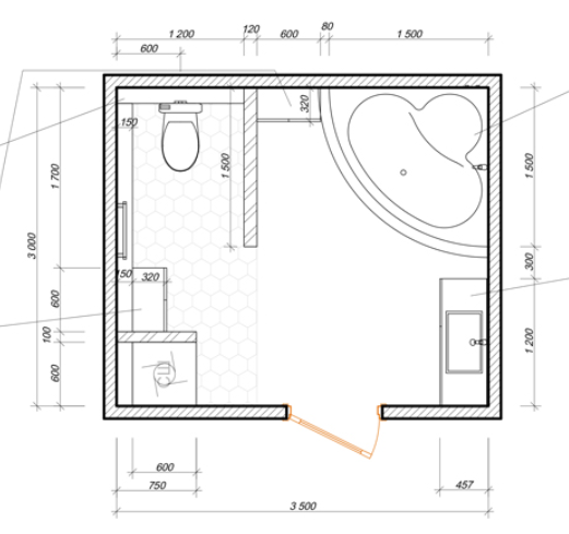 1. Снимите точные размеры Вашего помещения с учетом коробов и нарисуйте подробную схему расположения мебели и сантехники, см. пример: